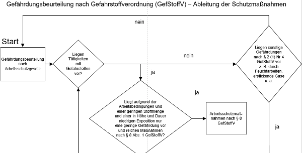 Zunächst ist zu klären, ob eine Gefährdungsbeurteilung nach Gefahrstoffverordnung erforderlich ist. Dazu hat der Arbeitgeber zu überprüfen,