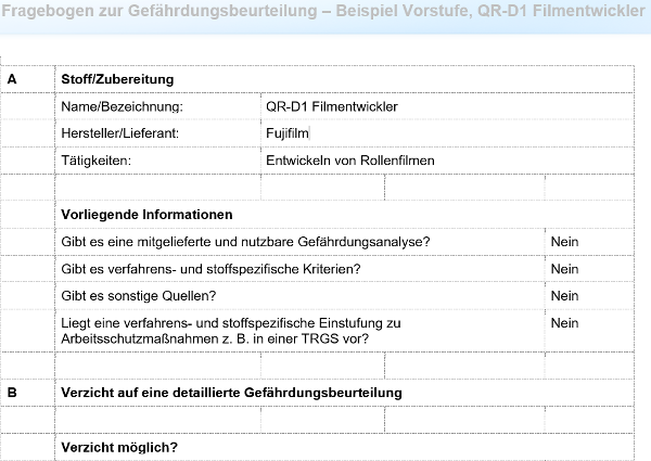 Es besteht die Möglichkeit, eine vom Hersteller oder Inverkehrbringer mitgelieferte Gefährdungsbeurteilung zu übernehmen. Dies ist jedoch nur in den Fällen möglich, in denen das Produkt exakt in dem Zustand verwendet wird, in dem man es bezogen hat, und wenn das Produkt genau in der Art und Weise verwendet wird, die vom Hersteller oder Inverkehrbringer beschrieben wird.