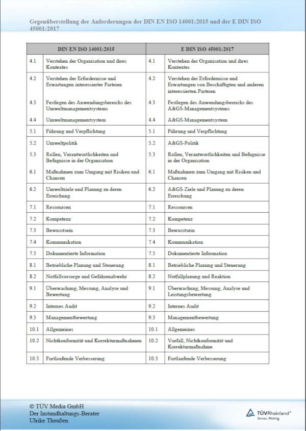 Stellt man die oben bereits erwähnten ISO-Normen nebeneinander, wird man schnell feststellen, welche Forderungen ähnlich sind und damit in einer Regelung zusammengefasst werden können. Die Tabelle in der angehängten pdf-Datei enthält eine Gegenüberstellung der Forderungen der ISO 14001 und der ISO 45001.[